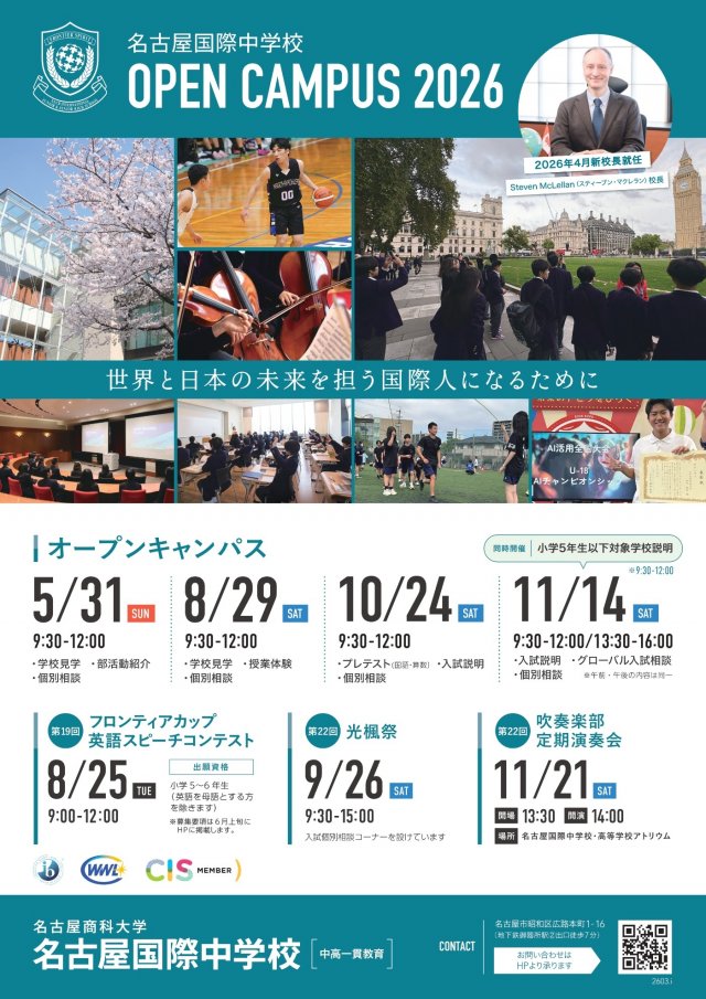 中学入試-2026年度オープンキャンパス HOME ニュース 中学入試-2026年度オープンキャンパス オープンキャンパス開催のお知らせ 名古屋国際中学校では2026年度のオープンキャンパス(学校見学会)を開催いたします。 以下のページよりお申し込みできますので、皆様のご参加をお待ちしております。 オープンキャンパスのお申し込みはこちら